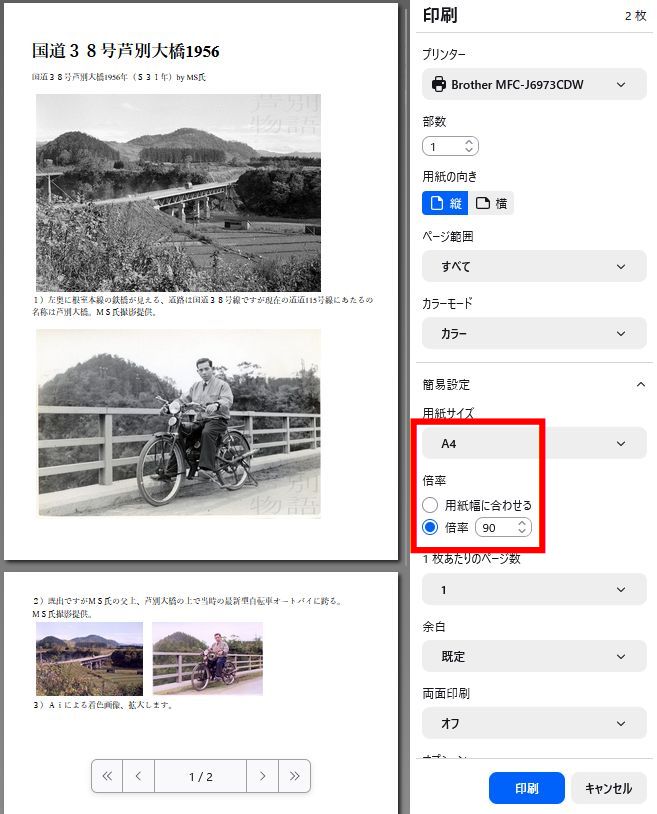 4)用紙サイズと倍率を決めて、右下の「印刷」をクリック。